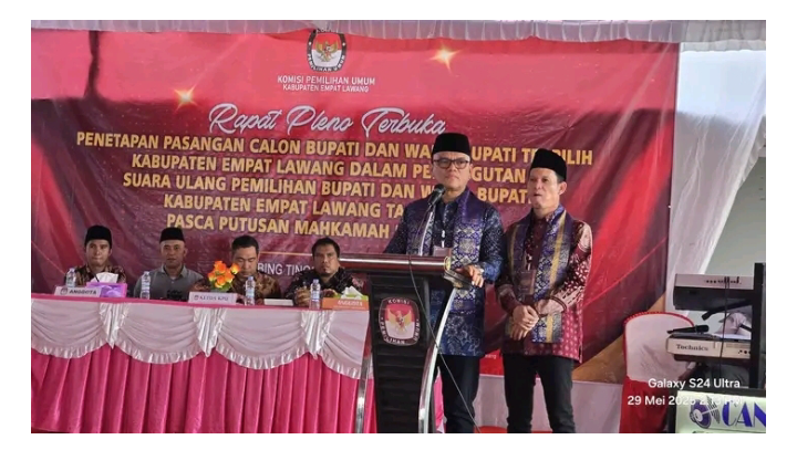 Bertempat di Kantor KPU Daerah Kabupaten Empat Lawang, Acara Rapat Pleno Terbuka Penetapan Pasangan Calon Bupati dan Wakil Bupati Terpilih Kabupaten Empat Lawang dalam Pemungutan Suara Ulang Pemilihan Bupati dan Wakil Bupati Empat Lawang Tahun 2024 Pasca Putusan Mahkamah Konstitusi (MK). Kamis, (29/05/2025). Pukul 13 : 00 WIB.