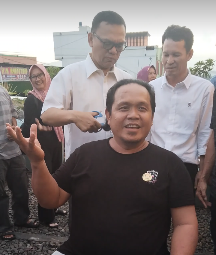 Proses pemotongan rambut dilakukan langsung oleh Bupati dan Wakil Bupati terpilih, Joncik Muhammad dan Arifa’i, di Ntwo Coffe, Jalan Lintas Sumatera, Kelurahan Tanjung Kupang, Kecamatan Tebing Tinggi.