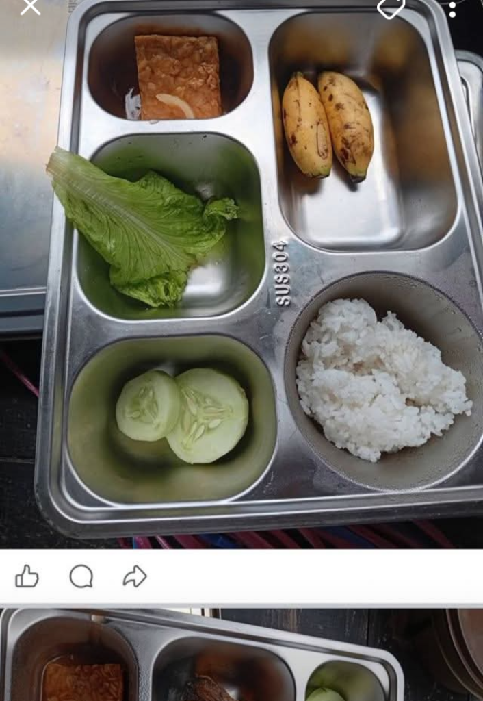 Berdasarkan informasi yang dihimpun awak media, menu MBG di dua sekolah di wilayah tersebut hanya berupa nasi, tempe, pisang, selembar sayur rebus, dan dua iris timun. Menu sederhana ini dinilai jauh dari standar gizi seimbang, serta tidak sebanding dengan besaran anggaran Rp15.000 per siswa.